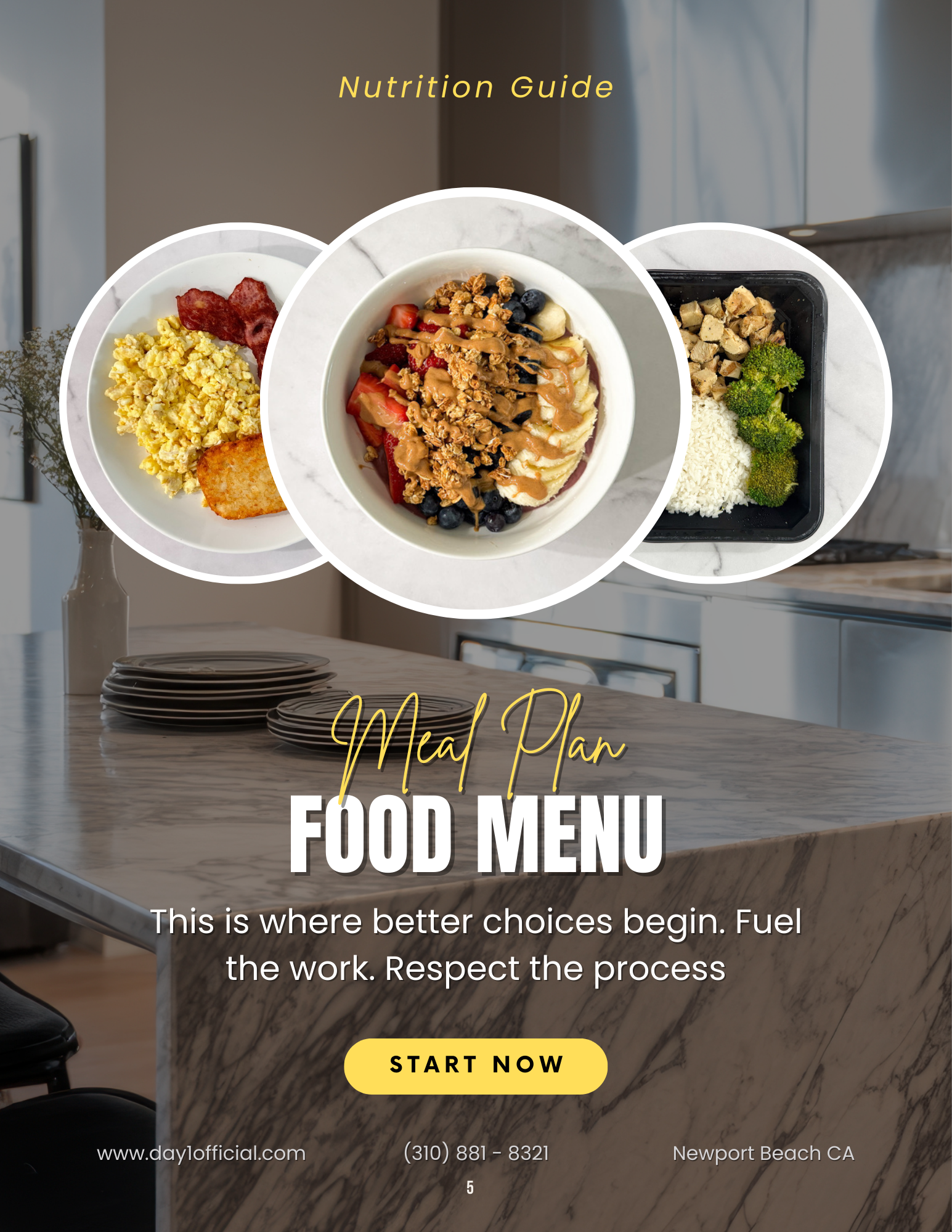 Learn the Day 1 approach to nutrition focused on balance, consistency, and performance without calorie counting or macro tracking. Covers meal structure, hydration, food timing, and mindset.Structured Food Menus